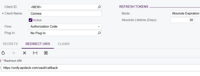 https://unify.apideck.com/vault/callbackas the redirect URI. This is the default redirect URI for Connex.