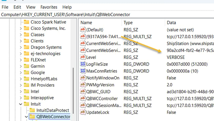 - HKEY_CURRENT_USER\Software\Intuit\QBWebConnector