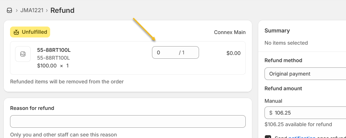 In Shopify, you can do a manual refund without refunding a product. If you want to see the SKUs refunded, select a product quantity: