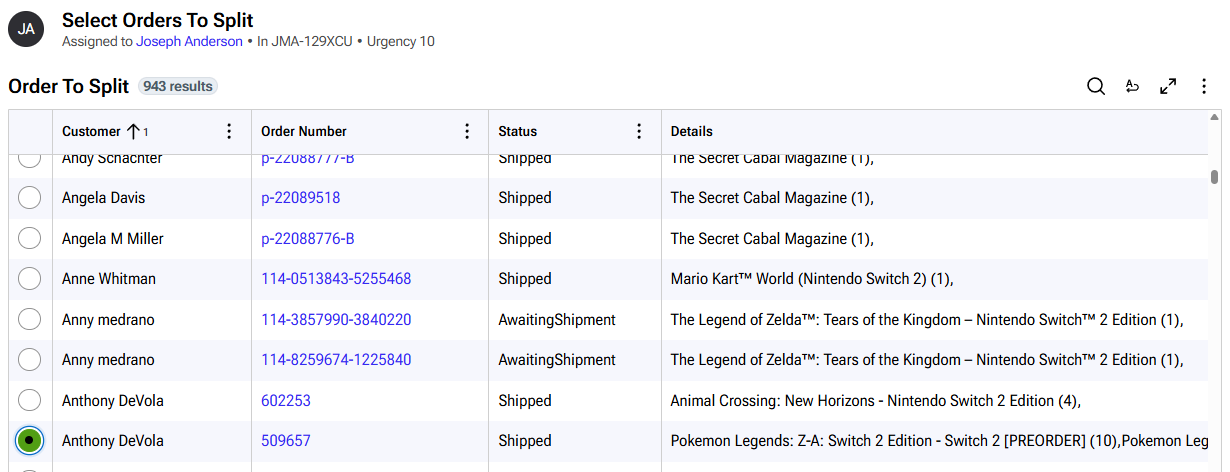 - Choose an order with multiple items to split: